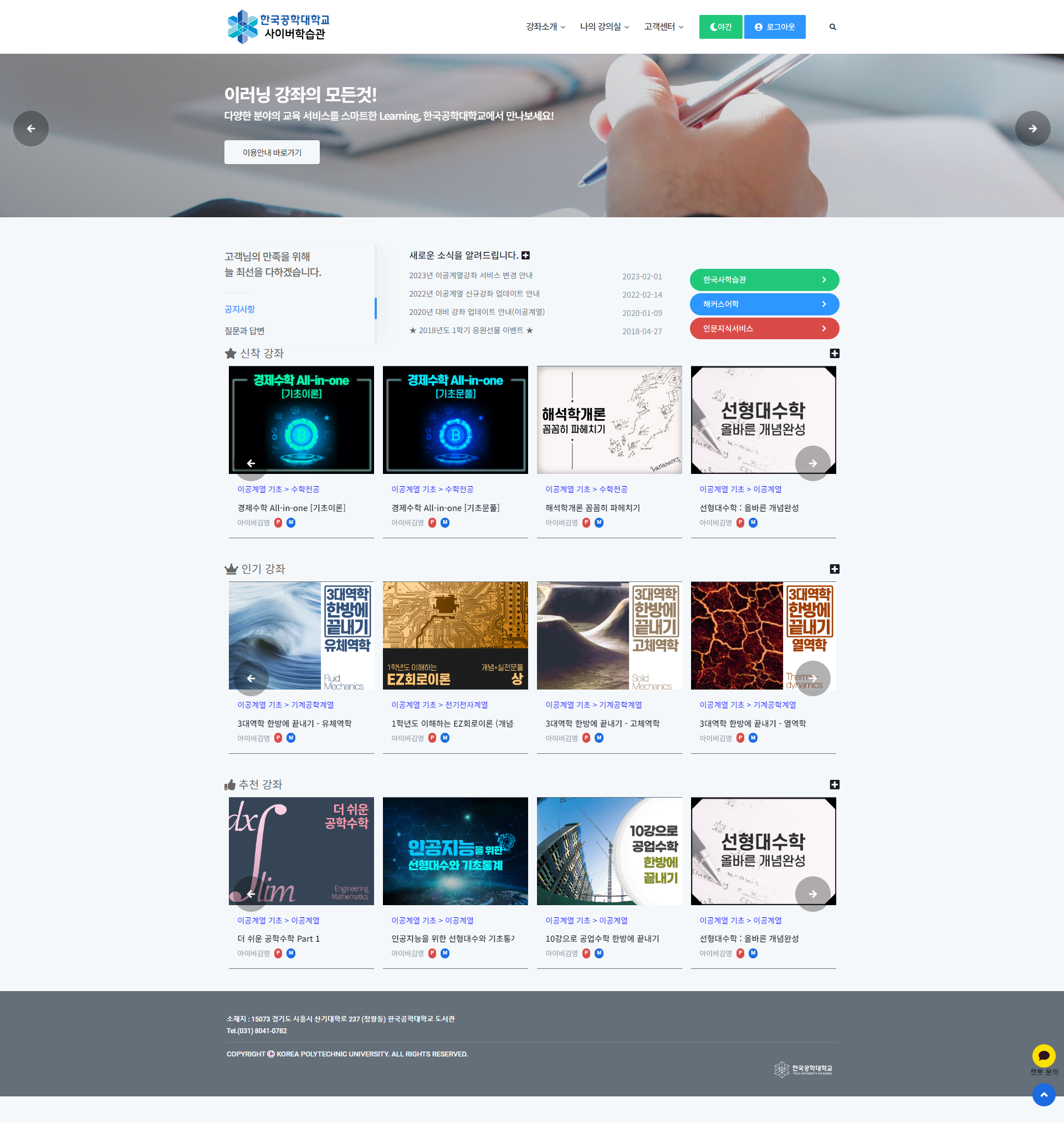 - 이공계열이러닝캠퍼스 : 기초수학, 이공계열, 기계공학, 전기전자 등 이공계열 관련 영상 서비스